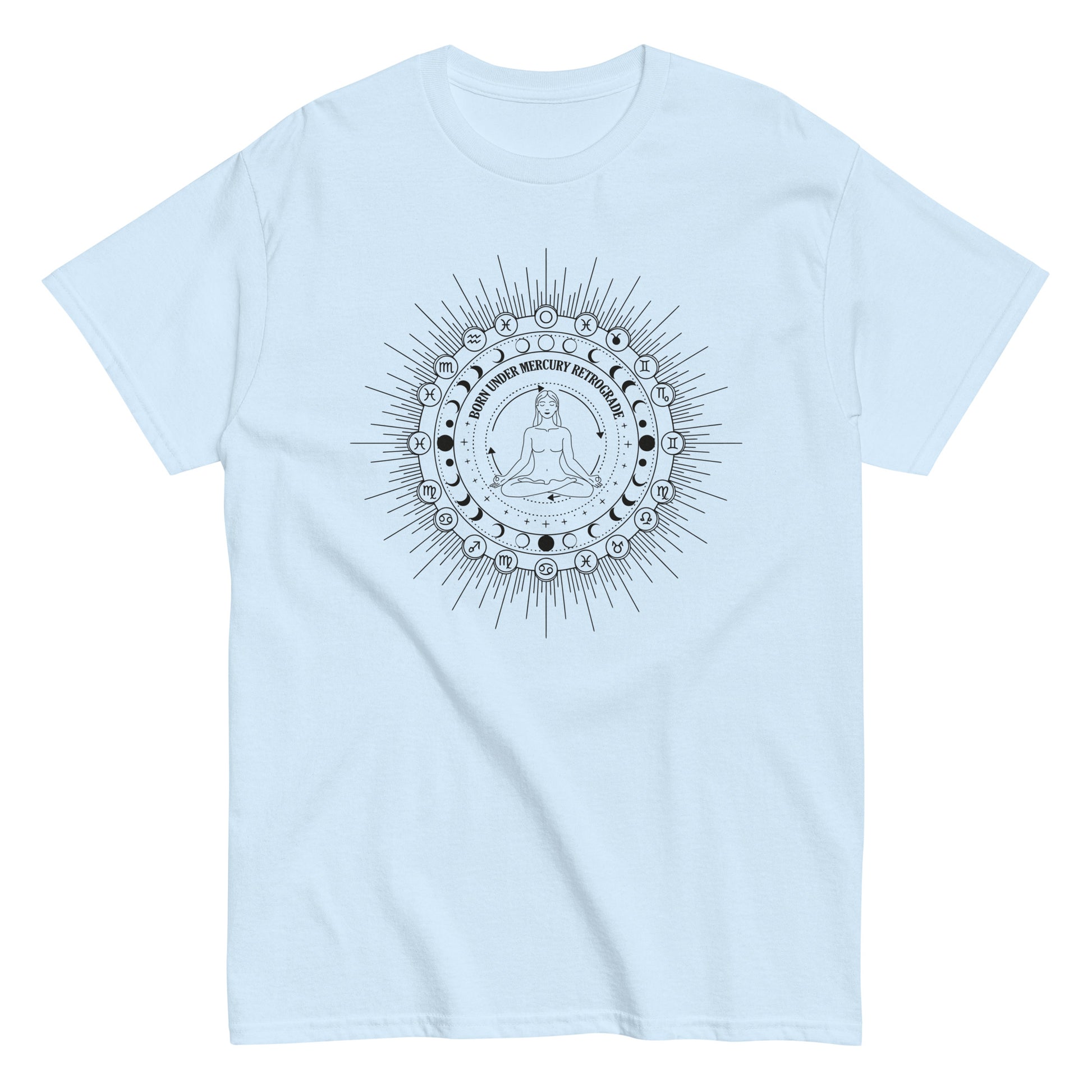 Navigate the cosmic chaos in style with our "Born Under Mercury Retrograde" T-shirt! This striking celestial design is a must-have for anyone immersed in the Occult, Mysticism, and Astrology world. It features a meditating figure surrounded by the Zodiac wheel and celestial symbols, making it the perfect statement piece for your spiritual or witchy wardrobe.