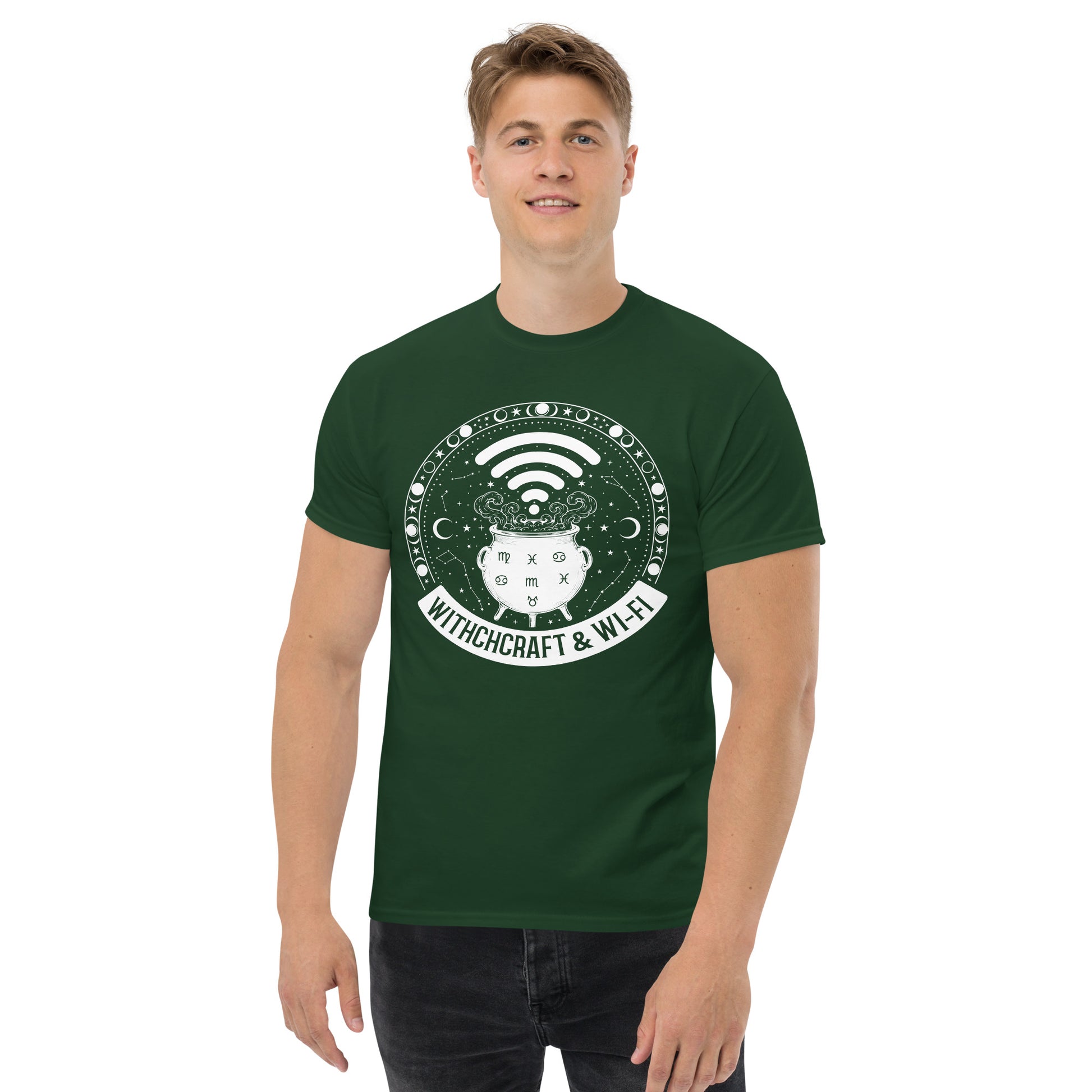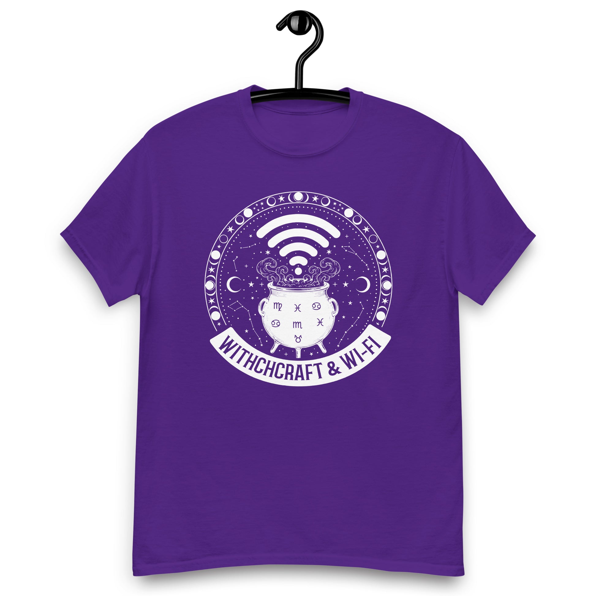 Cast spells and connect to the internet simultaneously! Our "Witchcraft & Wi-Fi" T-Shirt is the perfect blend of ancient tradition and modern convenience. This design features a bubbling cauldron surrounded by a celestial border of stars, moons, and zodiac signs, with a Wi-Fi signal replacing the steam.