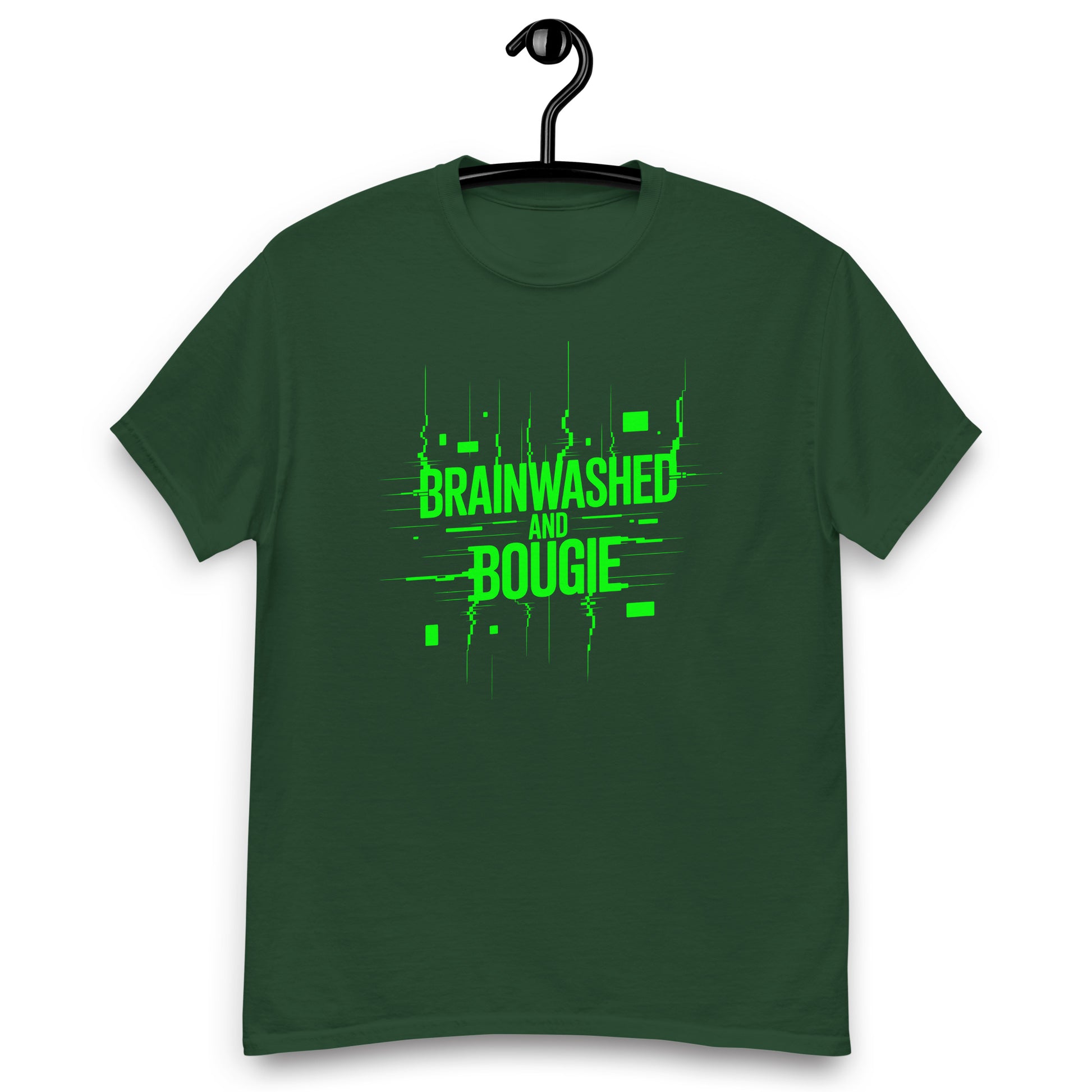 Step into a glam-meets-glitch aesthetic with this Brainwashed and Bougie tee. Featuring neon green distortion graphics on a deep forest backdrop, this design blends dystopian mind-control vibes with high-end attitude. Perfect for anyone who loves bold satire, cyber aesthetics, and a little bougie rebellion in their wardrobe
